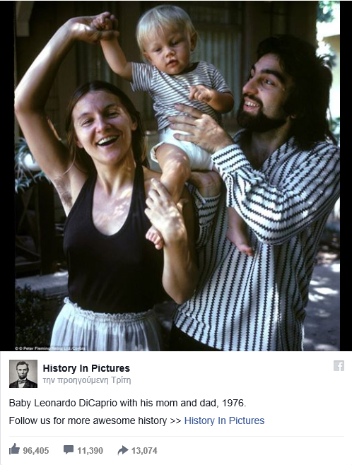 Όλα ξεκίνησαν όταν στη σελίδα του History in Pictures στο facebook δημοσιεύτηκε μία φωτογραφία η οποία και δείχνει τον Di Caprio μωρό ανάμεσα στους δύο γονείς του, George και Irmelin.