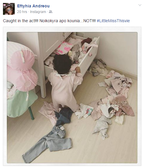 Η ίδια πόσταρε την πιο παιχνιδιάρικη φωτογραφία της κορούλα της, όταν η μικρή άνοιξε το συρτάρι με τα ρούχα της και τα πέταξε έξω. Η Ευτυχία, έγραψε χαριτολογώντας στη λεζάντα που τη συνόδευσε: “Την έπιασα στα πράσα. Νοικοκυρά από κούνια. ΌΧΙ”.