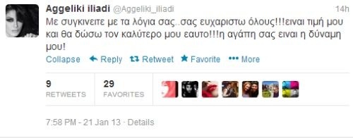 Είναι πλέον γεγονός ότι η Αγγελική Ηλιάδη θα συμμετάσχει στον ελληνικό τελικό επιλογής του τραγουδιού που θα εκπροσωπήσει την Ελλάδα στο διαγωνισμό της Eurovision. Χθες βράδυ είχαμε και την πρώτη αντίδραση της τραγουδίστριας μέσω Twitter. Μόλις διέρρευσε στον Τύπο η πληροφορία ότι η Αγγελική Ηλιάδη θα δοκιμάσει τις δυνάμεις της αμέσως οι θαυμαστές της έσπευσαν να της ευχηθούν καλή επιτυχία μέσω Twitter. Εκείνη τους απάντησε με ευχαριστίες.