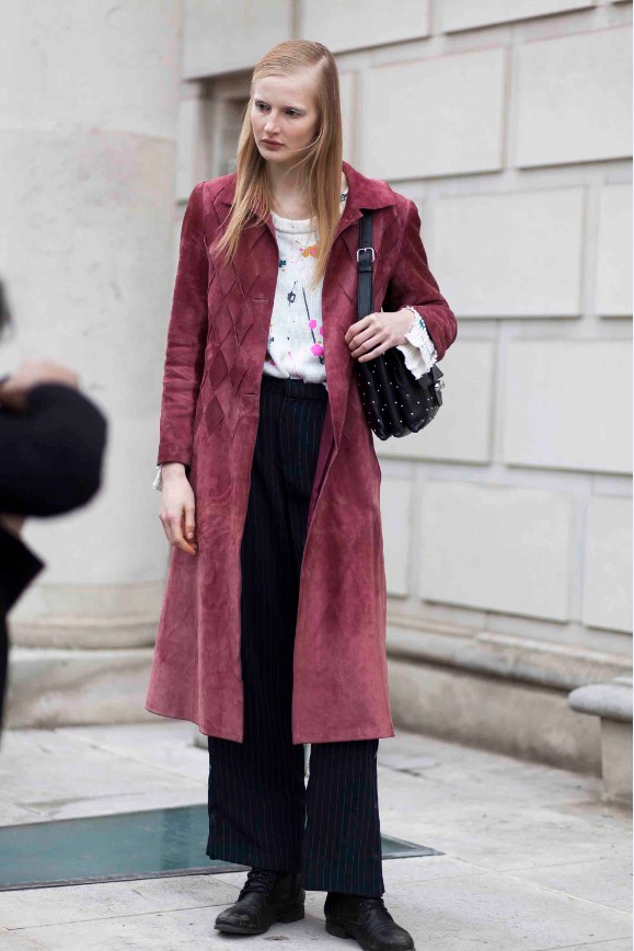 Το μακρύ suede παλτό με το ιδιαίτερο σχέδιο ταιριάζει εξαιρετικά με το αλαβάστρινο δέρμα του μοντέλου.