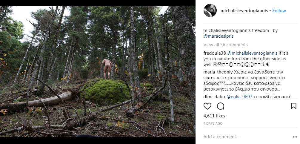 Ο λόγος για το Μιχάλη Λεβεντογιάννη, ο οποίος ανήρτησε στον προσωπικό του λογαριασμό στο instagram μία εικόνα, όπου απεικονίζεται ο ίδιος γυμνός να τρέχει μέσα στο δάσος, γράφοντας στη λεζάντα που τη συνόδευσε: “Freedom (ελευθερία)”.