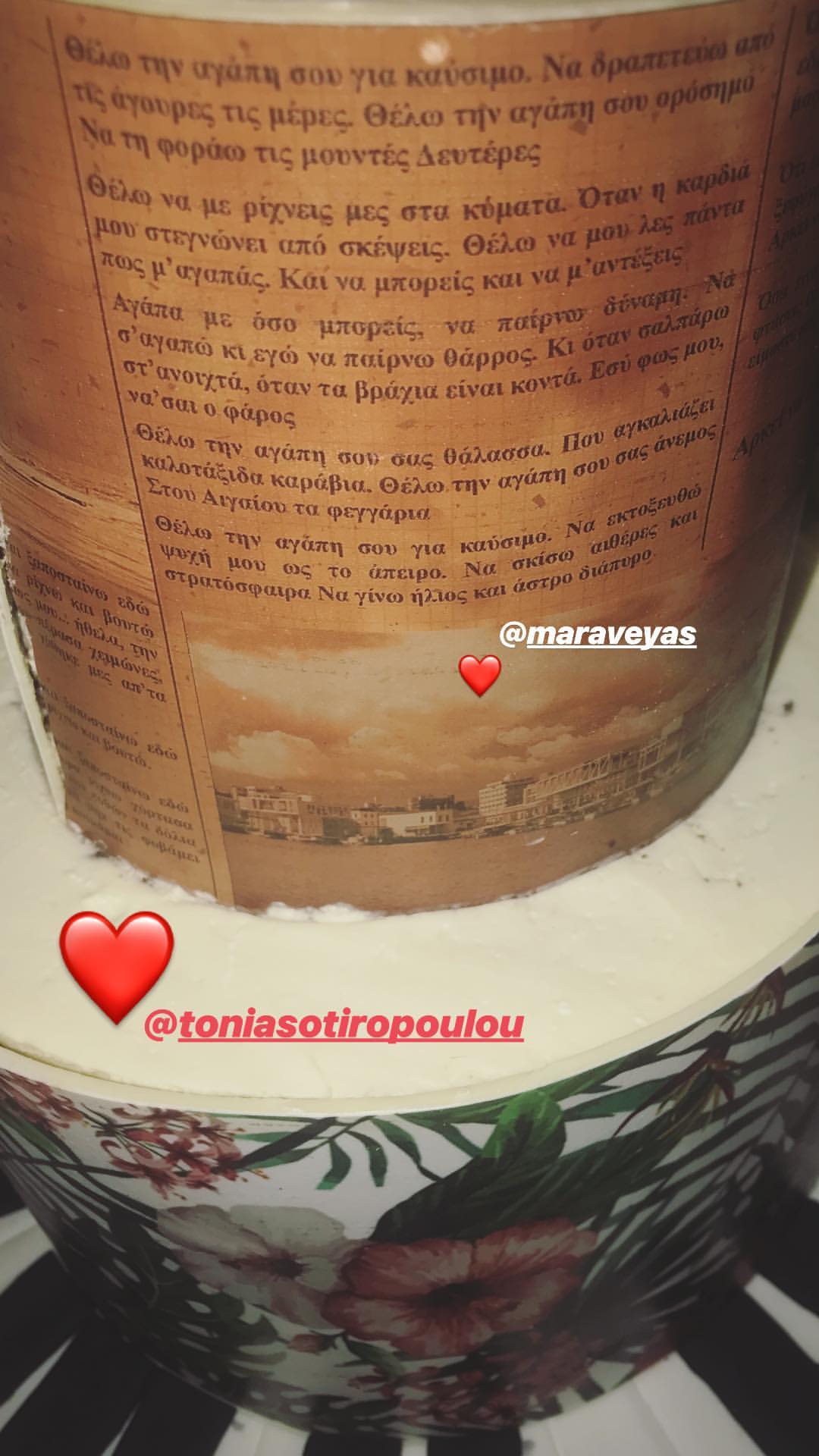 Τις εντυπώσεις “έκλεψε” η διώροφη τούρτα όπου σε αυτή αναγράφονταν στίχοι από το τραγούδι του Κωστή Μαραβέγια “Ο Φάρος”, γεγονός που ενθουσίασε πολύ την εορτάζουσα.