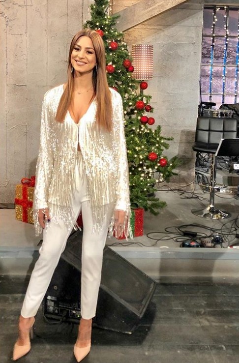 Η παρουσιάστρια, επέλεξε για την τηλεοπτική αυτή της εμφάνιση λευκό outfit που φέρει την υπογραφή του Gregory Morfi. Τα μαλλιά της επιμελήθηκε ο Χρήστος Αρτεμίου και το μακιγιάζ της η Έλενα Θεοδώρου που ταξίδεψαν μαζί της.