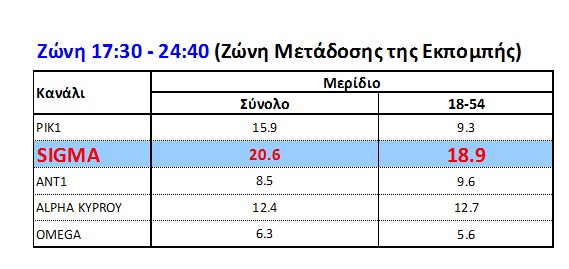 Αμέσως μετά τις 18:00 ο Δρ. Νάσιος Ορεινός παρουσίασε το exit poll του ΣΙΓΜΑ δίνοντας στους τηλεθεατές την πιο έγκυρη εκτίμηση αποτελέσματος της κρίσιμης χθεσινής εκλογικής αναμέτρησης. Το exit poll του ΣΙΓΜΑ (18:00-18:16) παρακολουθήσαν έστω για ένα λεπτό 80.896 τηλεθεατές.