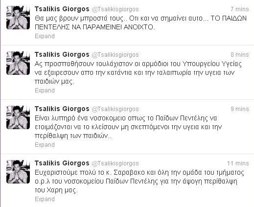 Μια περιπέτεια με την υγεία του είχε μικρός Χάρης, ο γιος του Γιώργου Τσαλίκη, και μαζί με τη σύζυγό του Δώρα τον μετέφεραν στο νοσοκομείο μετά και συγκεκριμένα στο Παίδων Πεντέλης, όπου τον μικρό τον εξέτασε ένας Ο.Ρ.Λ. Ο Γιώργος και η Δώρα έμειναν ικανοποιημένοι από τους γιατρούς που εξέτασαν τον Χάρη και ο τραγουδιστής θέλησε να τους ευχαριστήσει δημόσια μέσω της προσωπικής του σελίδας στο twitter. «Ευχαριστούμε πολύ τον κ. Σαραβάκο και όλη την ομάδα του τμήματος Ο.Ρ.Λ του νοσοκομείου Παίδων Πεντέλης για την άψογη περίθαλψη του Χάρη μας», έγραψε ο Γιώργος Τσαλίκης. Αυτό όμως που εξόργισε τον τραγουδιστή είναι το γεγονός ότι το συγκεκριμένο νοσοκομείο πολύ σύντομα θα κλείσει. «Είναι λυπηρό ένα νοσοκομείο όπως το Παίδων Πεντέλης να ετοιμάζονται να το κλείσουν μη σκεπτόμενοι την υγεία και την περίθαλψη των παιδιών. Ας προσπαθήσουν τουλάχιστον οι αρμόδιοι του Υπουργείου Υγείας να εξαιρέσουν από την κατάντια και την ταλαιπωρία την υγεία των παιδιών μας. Θα μας βρουν μπροστά τους… Ότι και να σημαίνει αυτό… ΤΟ ΠΑΙΔΩΝ ΠΕΝΤΕΛΗΣ ΝΑ ΠΑΡΑΜΕΙΝΕΙ ΑΝΟΙΧΤΟ», έγραψε αρκετά φορτισμένος.