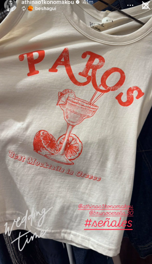 Η ηθοποιός και επιχειρηματίας που πρόσφατα γιόρτασε με ένα υπέροχο party τα 40α της γενέθλια το πρωί της Παρασκευής 13 Μαρτίου μας έδειξε ένα custom made t-shirt στο οποίο αναγραφόταν το μέρος που θα γίνει ο γάμος τους, η Πάρος, ενώ στο κάτω μέρος της εικόνες ήταν σαφές πως επρόκειτο για τον γάμο. Δείτε πιο κάτω το σχετικό στιγμιότυπο που εντοπίσαμε στα social media: