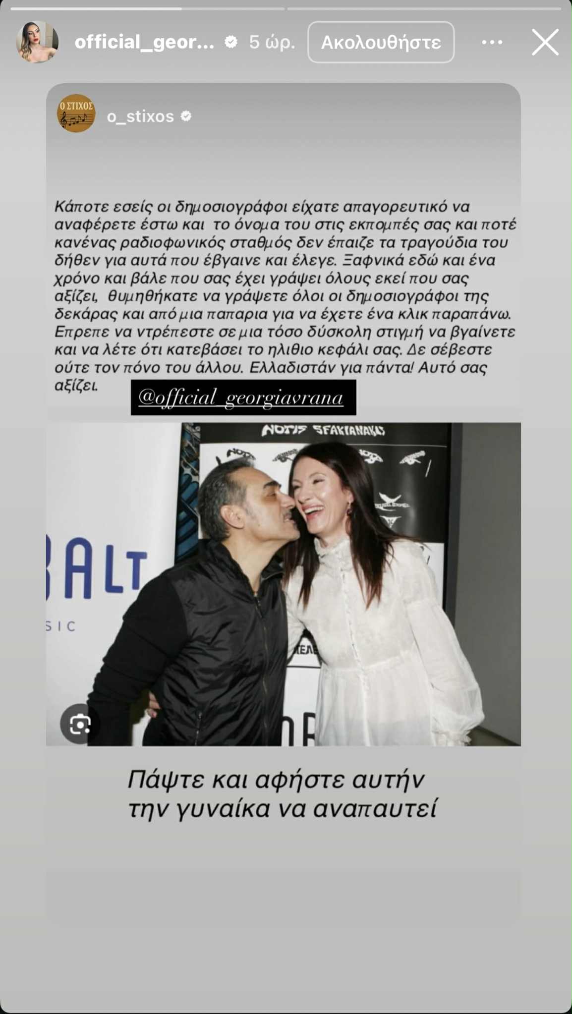 Χαρακτηριστικά, η Κύπρια τραγουδίστρια, η οποία στο παρελθόν είχε μία άριστη συνεργασία με τον τραγουδιστή, δημοσίευσε μέσα από τον προσωπικό της λογαριασμό στο instagram ένα στιγμιότυπο του Σφακιανάκη μαζί με τη σύζυγο του γράφοντας το εξής: «Κάποτε εσείς οι δημοσιογράφοι είχατε απαγορευτικό να αναφέρετε έστω και το όνομα του στις εκπομπές σας και ποτέ κανένας ραδιοφωνικός σταθμός δεν έπαιζε τα τραγούδια του δήθεν γι’ αυτά που έβγαινε και έλεγε. Ξαφνικά εδώ και ένα χρόνο και βάλε που σα έχει γράψει όλους εκεί που σας αξίζει, θυμηθήκατε να ράψετε όλοι οι δημοσιογράφοι της δεκάρας και από μια π@@ριά για να έχετε ένα κλικ παραπάνω. Έπρεπε να ντρέπεστε σε μια τόσο δύσκολη στιγμή να βγαίνετε και να λέτε ότι κατεβάσει το ηλίθιο κεφάλι σας. Δεν σέβεστε ούτε το πόνο του άλλου. Ελλαδιστάν για πάντα! Αυτό σας αξίζει, Πάψτε και αφήστε τη γυναίκα να αναπαυτεί». Δείτε το σχετικό στιγμιότυπο: