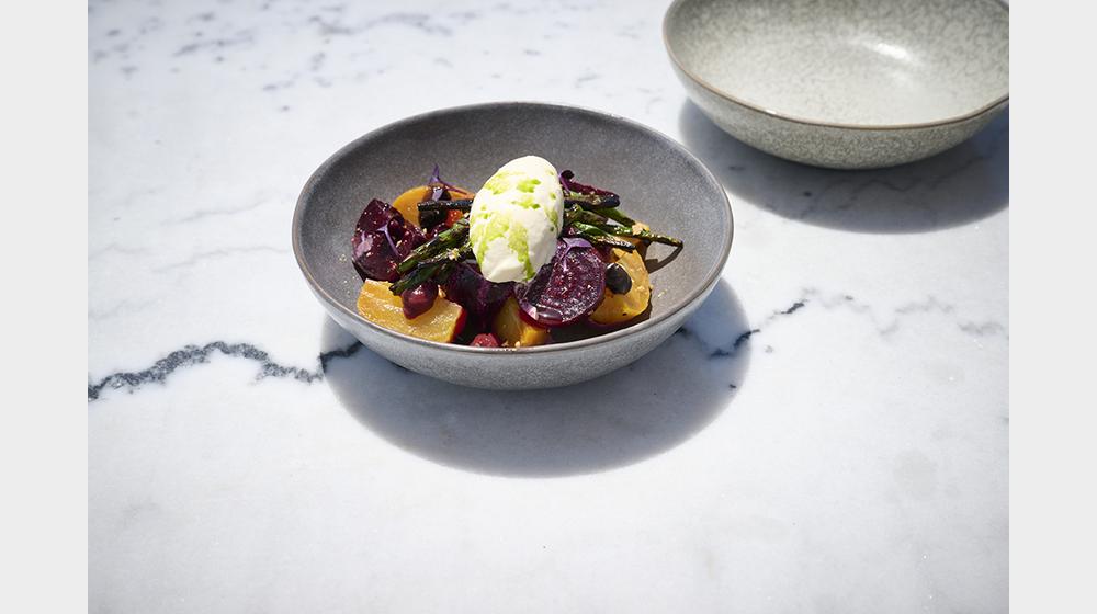 – Αρνί μπρεζέ, πουρέ μελιτζάνας, κρέμα κρεμμύδι, jus, σπαράγγια