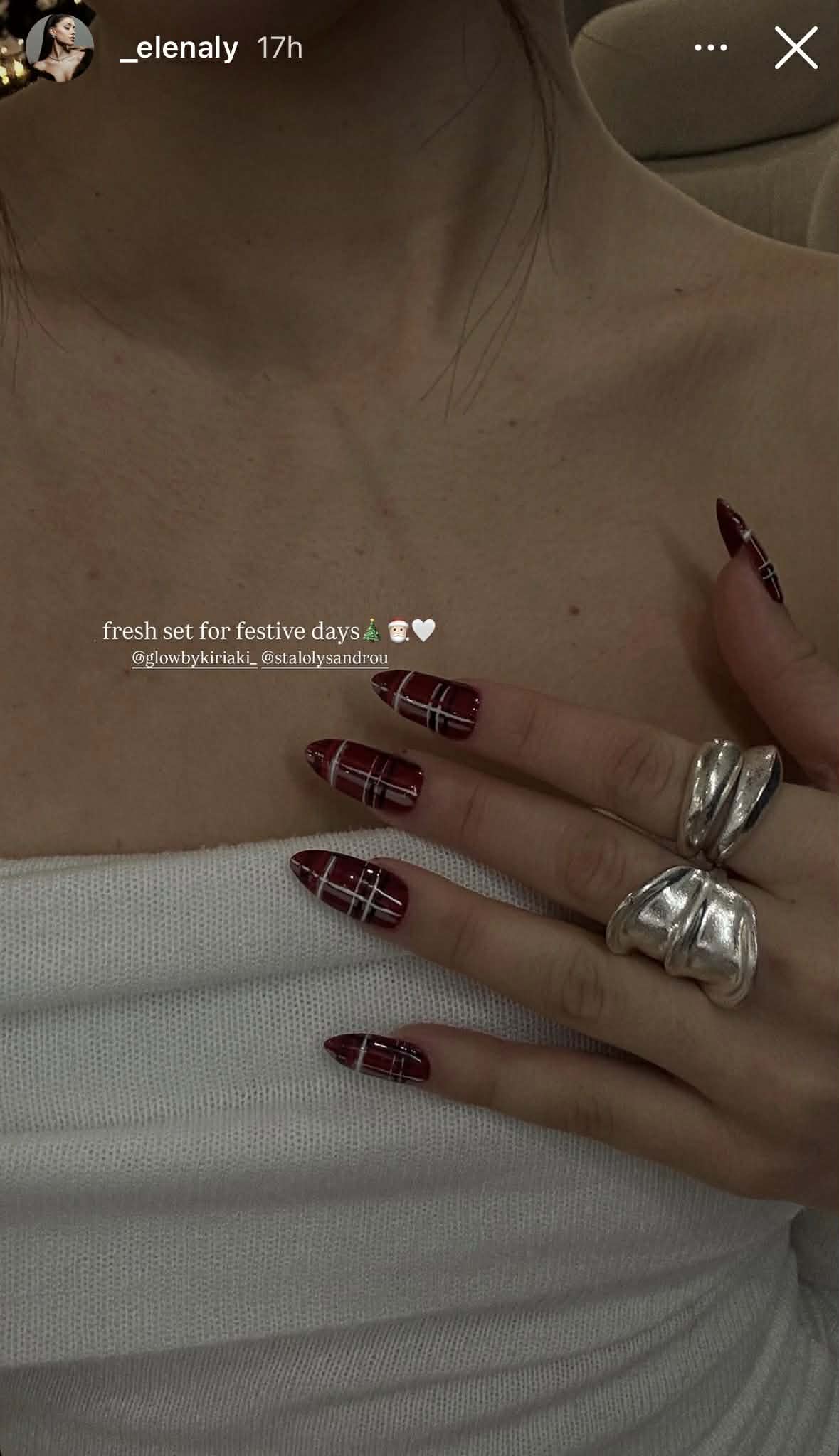 Η περίοδος των γιορτών είναι η ιδανική αφορμή για μικρές αλλά εντυπωσιακές αλλαγές στην εμφάνισή μας και η Έλενα Λυσάνδρου μάς δίνει για ακόμη μία φορά το απόλυτο beauty inspo. Αυτή τη φορά, η επιλογή της στα νύχια αποπνέει κομψότητα, γιορτινή διάθεση και διαχρονικό στιλ, αποδεικνύοντας πως το festive manicure δεν χρειάζεται υπερβολές για να ξεχωρίσει.