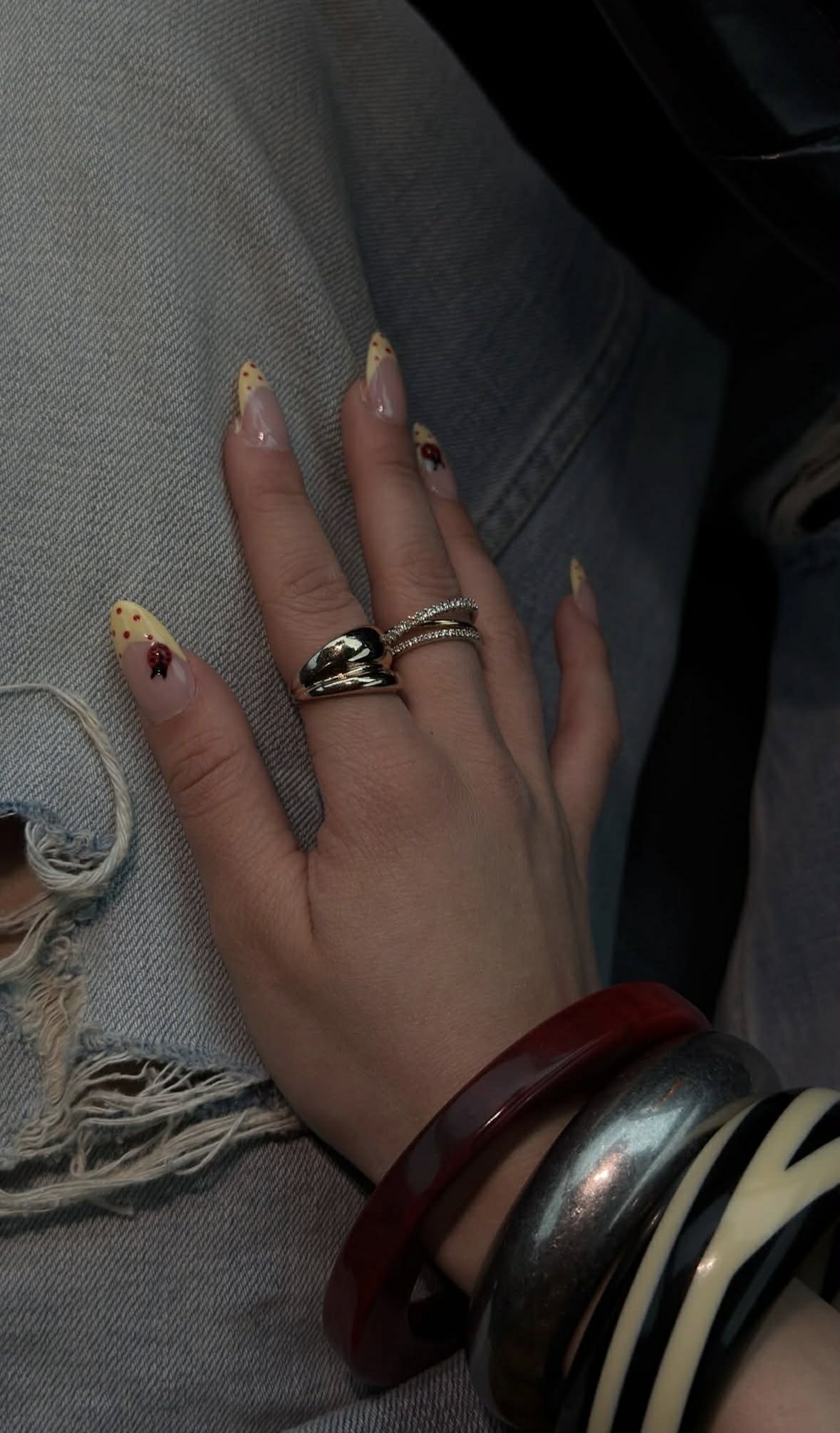Ωστόσο, το nail look της δεν σταματά εκεί. Η δεύτερη τάση που ενσωμάτωσε είναι τα playful patterns, με πουά σε έντονο κόκκινο χρώμα να δίνουν χαρακτήρα και μια retro chic αισθητική. Οι μικρές αυτές λεπτομέρειες δημιουργούν μια ενδιαφέρουσα αντίθεση με τη βάση, κάνοντας το αποτέλεσμα πιο ξεχωριστό και fashion-forward.