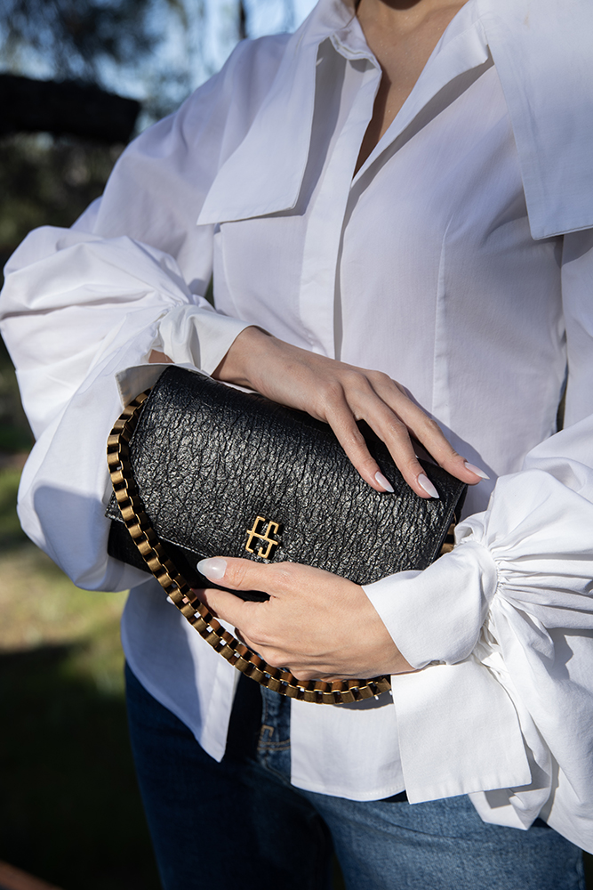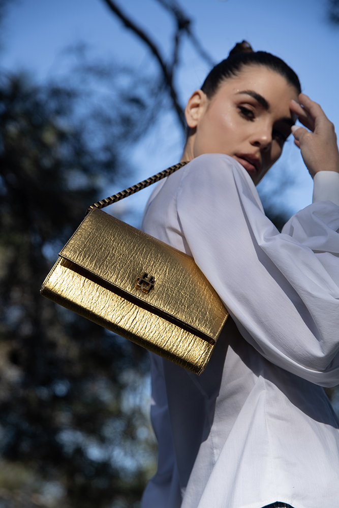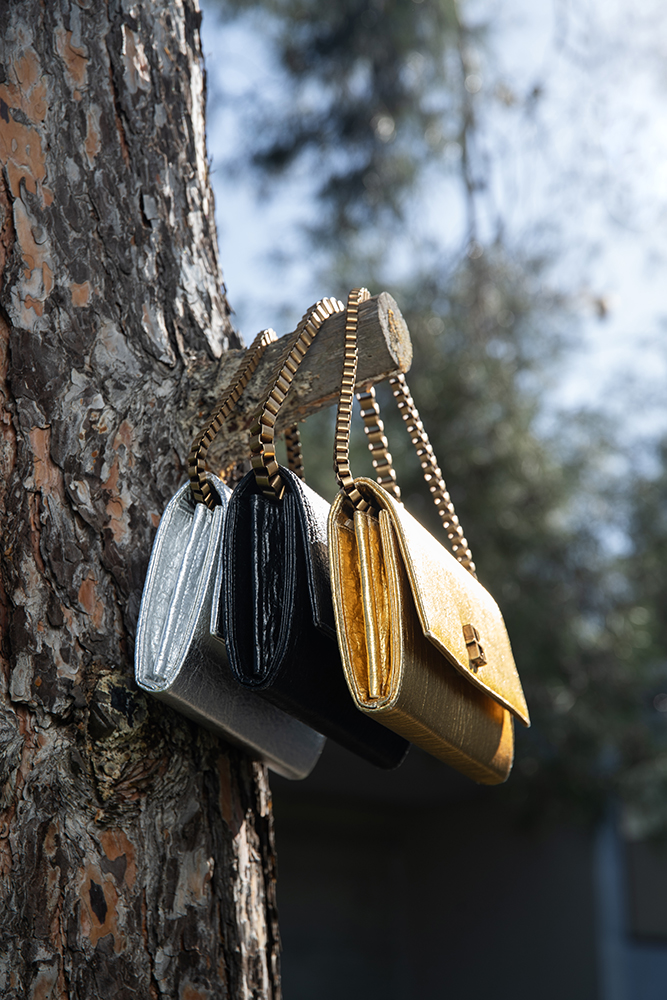 Η κόρη μου η οποία είναι sustainable consultant και εργάζεται στο εξωτερικό. Θα έλεγα πως μου άνοιξε τα μάτια και με ευαισθητοποίησε ως προς τη βιωσιμότητα. Έτσι αποφάσισα αυτή η συλλογή να περιλαμβάνει sustainable δημιουργίες. Όλες οι τσάντες είναι φτιαγμένες από υλικά φιλικά προς το περιβάλλον και την ανθρώπινη υγεία. Όπως δέρμα ανανά, βελούδο κοτλέ από βιώσιμο βαμβάκι, Dralon Fabric από 100% ακρυλικές ίνες και οργανικό βαμβάκι με χαμηλό περιβαλλοντικό αντίκτυπο. Επίσης το λογότυπο στις τσάντες, οι αλυσίδες και όλες οι λεπτομέρειες είναι κατασκευασμένα από οικολογικό ορείχαλκο, υλικό φιλικό στο περιβάλλον και την ανθρώπινη υγεία χωρίς να περιέχει νικέλιο και μόλυβδο.