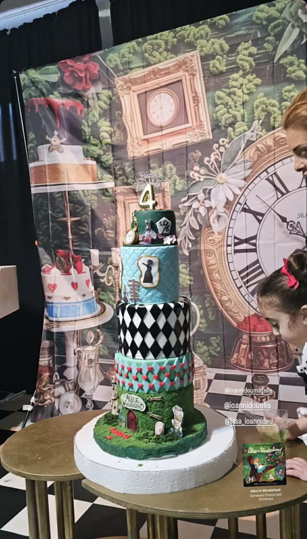 Κεντρικό στοιχείο του πάρτι ήταν η εντυπωσιακή πενταόροφη τούρτα, διακοσμημένη με χαρακτηριστικά μοτίβα από τον κόσμο της Αλίκης, όπως ρολόγια, τραπουλόχαρτα και φιγούρες του παραμυθιού.