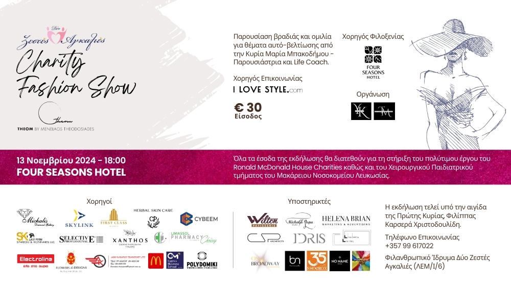 Η φιλανθρωπική εκδήλωση θα περιλαμβάνει Fashion Show, στο οποίο θα απολαύσουμε τις υπέροχες δημιουργίες του καταξιωμένου Κύπριου σχεδιαστή μόδας, Μενέλαου Θεοδοσιάδη (THEOM DESIGN) καθώς και παρουσίαση και life coaching σε θέματα αυτοβελτίωσης από την καταξιωμένη Μαρία Μπακοδήμου.