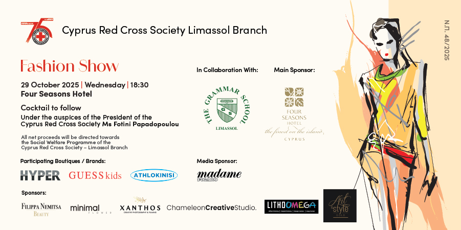 Ο Κυπριακός Ερυθρός Σταυρός – Κλάδος Λεμεσού, σε συνεργασία με το Grammar School Limassol και τα καταστήματα HYPER, ATHLOKINISI και GUESS KIDS διοργανώνει μια λαμπερή βραδιά μόδας, την Τετάρτη 29 Οκτωβρίου 2025, στις 6:30 μ.μ., στο ξενοδοχείο Four Seasons.