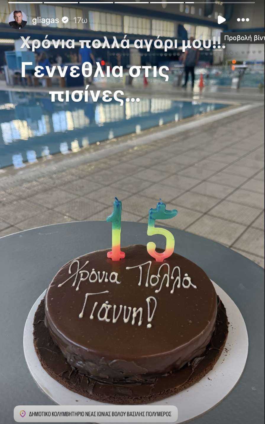 Ο Γιώργος Λιάγκας, σε story, δημοσίευσε τη γενέθλια τούρτα του γιου του, από το κολυμβητήριο, αφιερώνοντας του τις εξής ευχές: «Χρόνια πολλά αγόρι μου. Γενέθλια στις πισίνες».