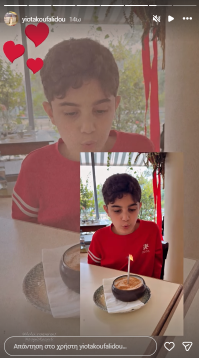 Mε stickers στα stories της, η Γιώτα Κουφαλίδου, ευχήθηκε στο γιο της, τα εξής: «Ο Θεός να σε ευλογά στα γενέθλιά σου. Σε αγαπάμε».