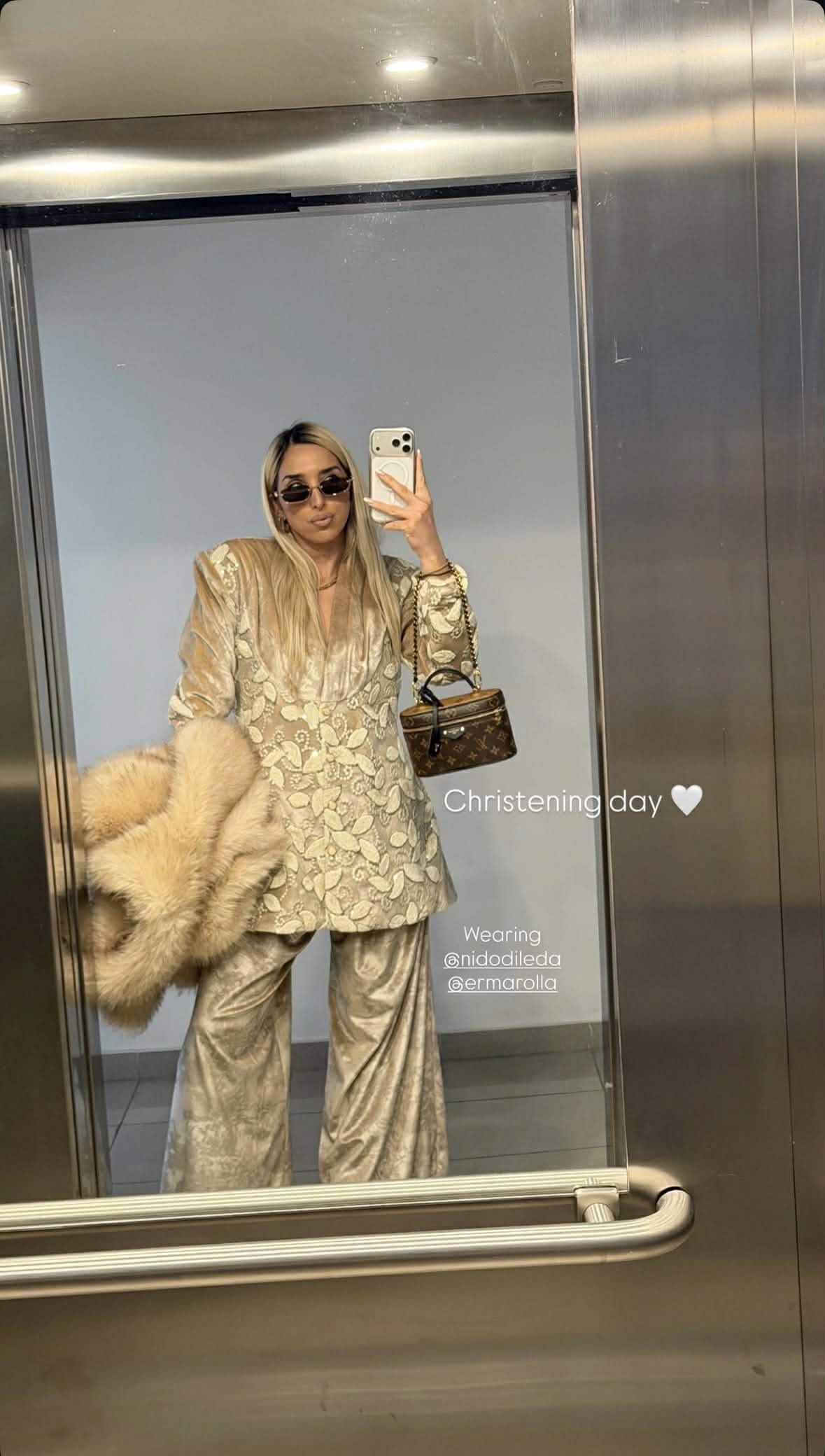 Το κεντρικό κομμάτι του συνόλου ήταν ένα velvet lace embellished blazer σε χρυσαφένιες αποχρώσεις με ανάγλυφο floral μοτίβο και λεπτομέρειες που παραπέμπουν σε haute couture αισθητική. Το blazer συνδυάστηκε με μια high -waist velvet παντελόνα, στην ίδια χρωματική αρμονία, δημιουργώντας ένα αψεγάδιαστο co-ord.