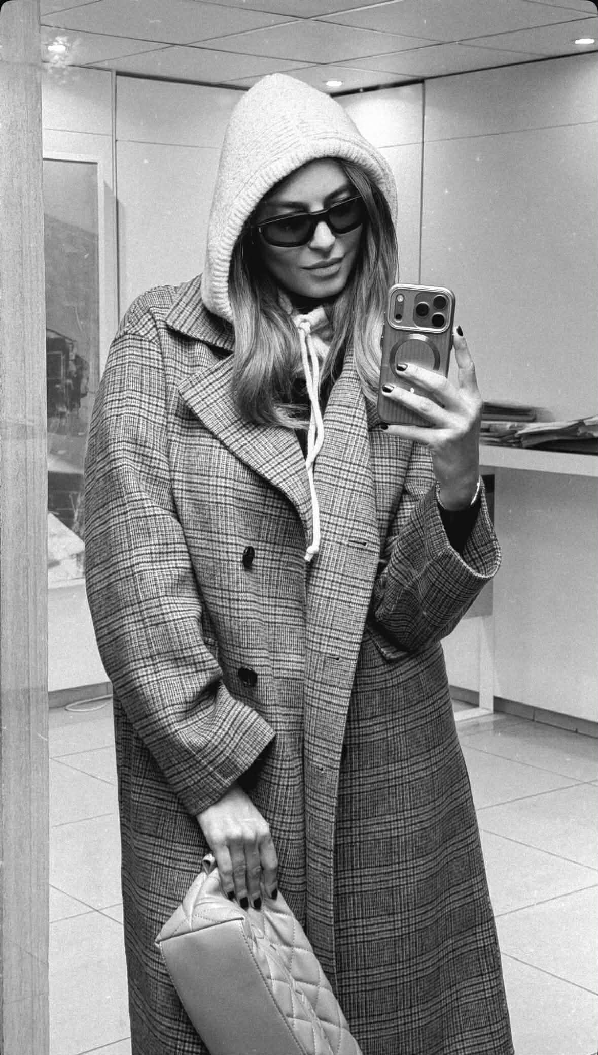 Στη φωτογραφία, τη βλέπουμε να υιοθετεί ένα effortlessly chic layering, φορώντας ένα oversized καρό παλτό, ένα κομμάτι που μπορεί να φορεθεί από το πρωί μέχρι το βράδυ και να προσαρμοστεί σε κάθε στιλ. Από μέσα, το hoodie δίνει έναν σύγχρονο, urban χαρακτήρα στο look, αποδεικνύοντας πως το mix & match ανάμεσα στο casual και το tailored είναι το μυστικό του σύγχρονου street style.