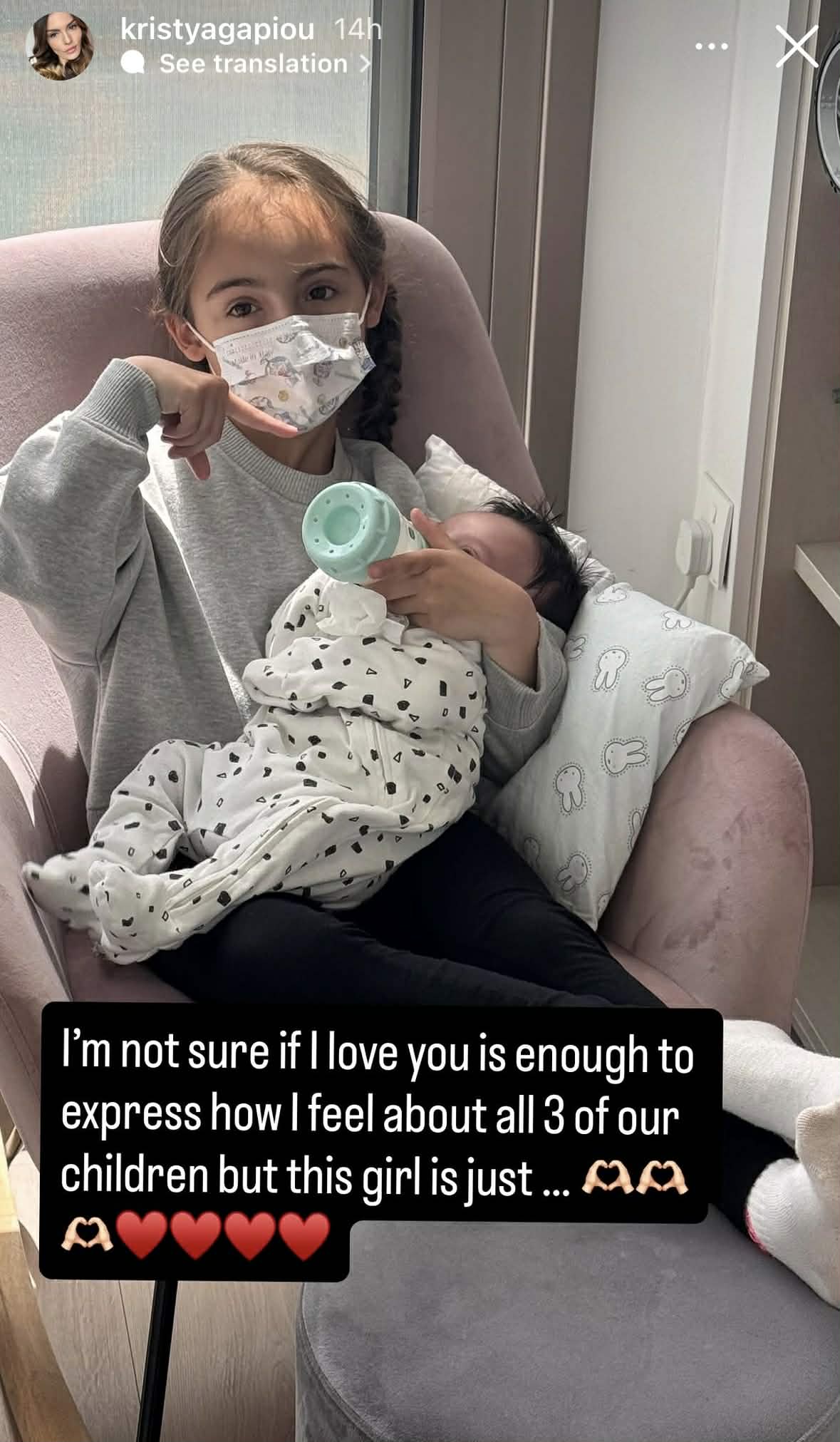 Σε πρόσφατη ανάρτησή της, βλέπουμε την κόρη της Ελύσια, το μεγαλύτερο παιδί της οικογένειας, να έχει στην αγκαλιά της το νεογέννητο αδερφάκι της και να του δίνει το γάλα του, δείχνοντας φροντίδα ως προστατευτική μεγάλη αδερφή.