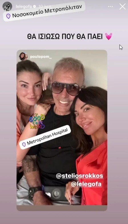 Σε ιδιωτικό νοσοκομείο της Αθήνας νοσηλεύεται τις τελευταίες ώρες η Λελέ Γκόφα, σύντροφος του Στέλιου Ρόκκου. Την αποκάλυψη την έκανε η ίδια όταν είδαμε ένα repost της από το νοσοκομείο σχολιάζοντας: «Θα ισιώσω που θα πάει».