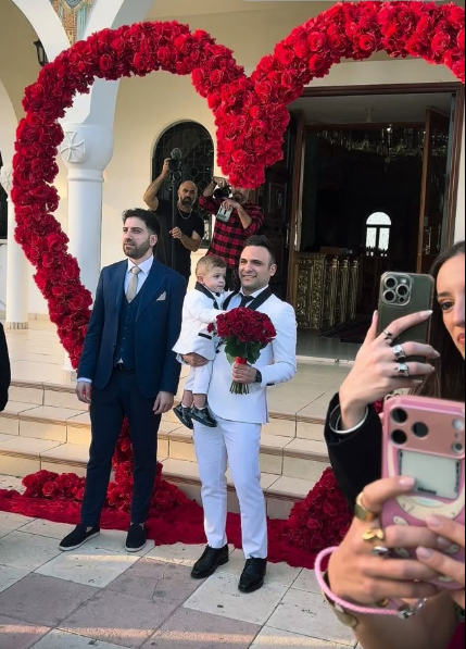 Η νύφη έφτασε στην εκκλησία με την προβλεπόμενη καθυστέρηση, όπου την περίμεναν ο σύζυγός της έχοντας στην αγκαλιά του τον γιο τους, Πέτρο.