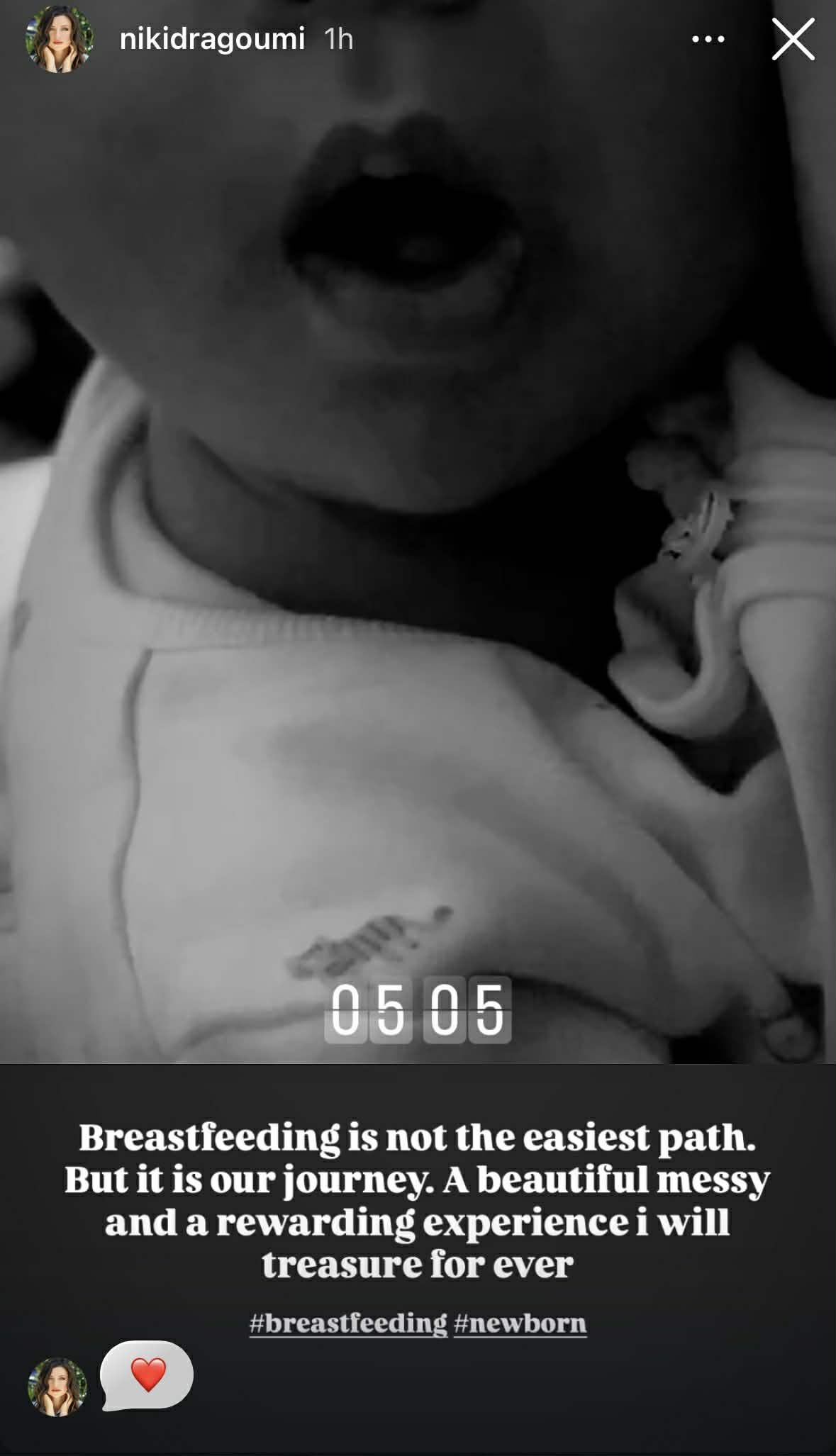 «Ο θηλασμός δεν είναι ο πιο εύκολος δρόμος. Αλλά είναι το δικό μας ταξίδι. Μια όμορφη, ακατάστατη και ανταποδοτική εμπειρία που θα θυμάμαι για πάντα», έγραψε η Δραγούμη στην εικόνα.