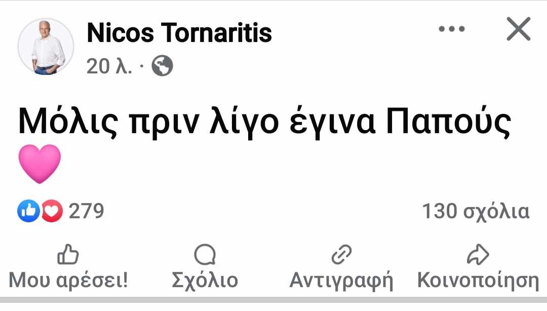 «Μόλις πριν λίγο έγινε παππούς» έγραψε ο Νίκος Τορναρίτης και έλαβε εκατοντάδες σχόλια και ευχές που τον συγκίνησαν. Αξίζει να σημειωθεί ότι και η δεύτερη κόρη του Νίκου και της Λίας Τορναρίτη εγκυμονεί περιμένοντας και εκείνη σύντομα κοριτσάκι. Η ομάδα του ilovetsyle.com εύχεται να τους ζήσει το νέο μέλος της οικογένειας τους.