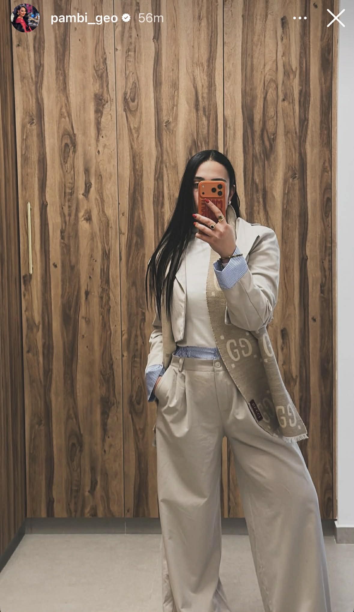 Η Παμπίνα Γεωργίου απέδειξε πως το μυστικό ενός επιτυχημένου look κρύβεται στις λεπτομέρειες. Σε μια κομψή mirror selfie, η ίδια επέλεξε ένα διαχρονικό, tailored σύνολο σε μπεζ αποχρώσεις, ωστόσο αυτό που πραγματικά απογείωσε την εμφάνισή της ήταν το εμβληματικό κασκόλ της από τον οίκο Gucci.