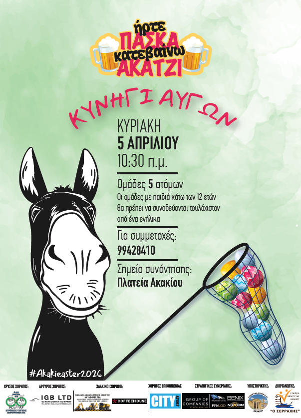 Η Εταιρεία Ανάπτυξης Ακακίου «Ο ΣΕΡΡΑΧΗΣ» διοργανώνει και προσκαλεί όλους, ακόμη μια χρονιά, στις Πασχαλινές εκδηλώσεις στην Πλατεία Ακακίου, την Κυριακή και Δευτέρα του Πάσχα, 12 και 13 Απριλίου! Σύνθημα «Ήρτεν Πάσκα Κατεβαίνω Ακάτζι»!