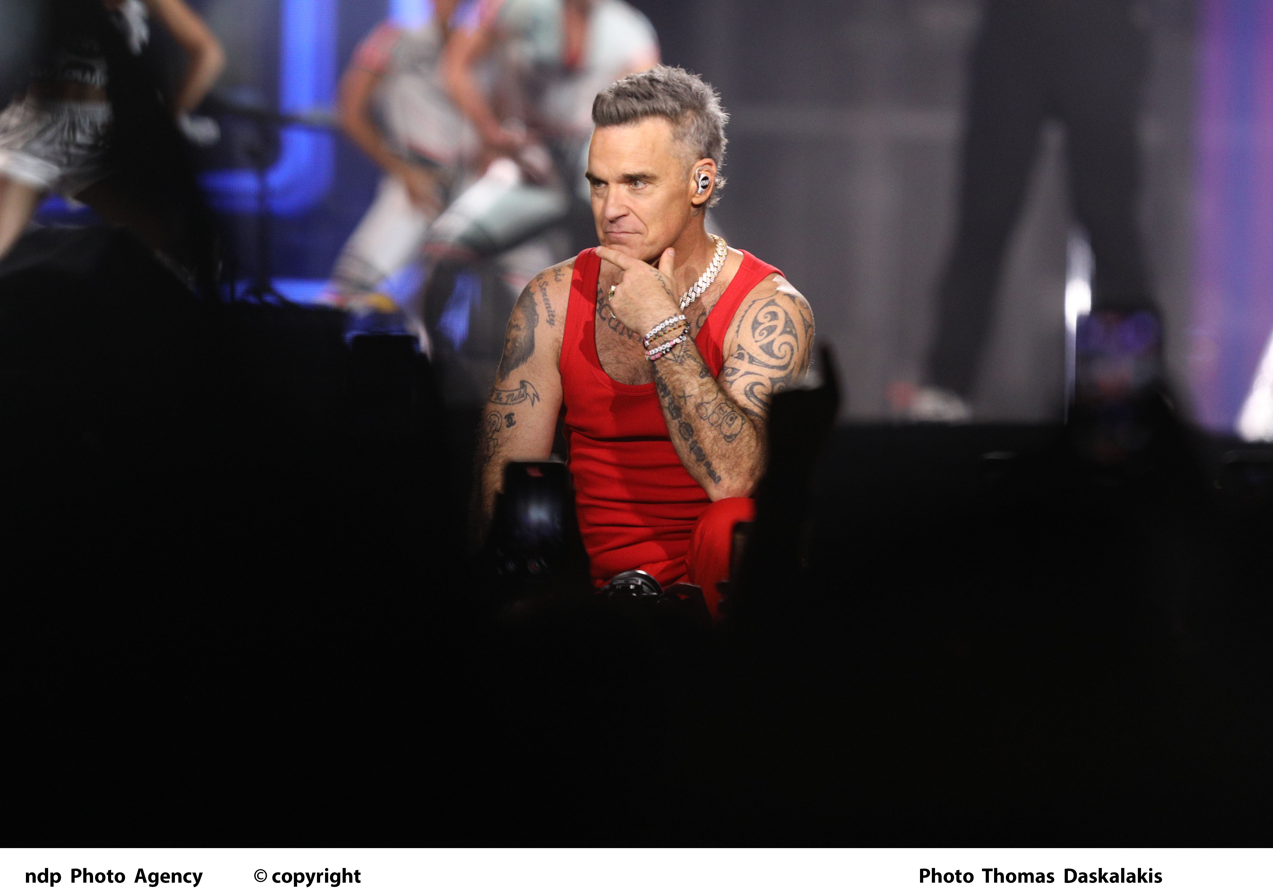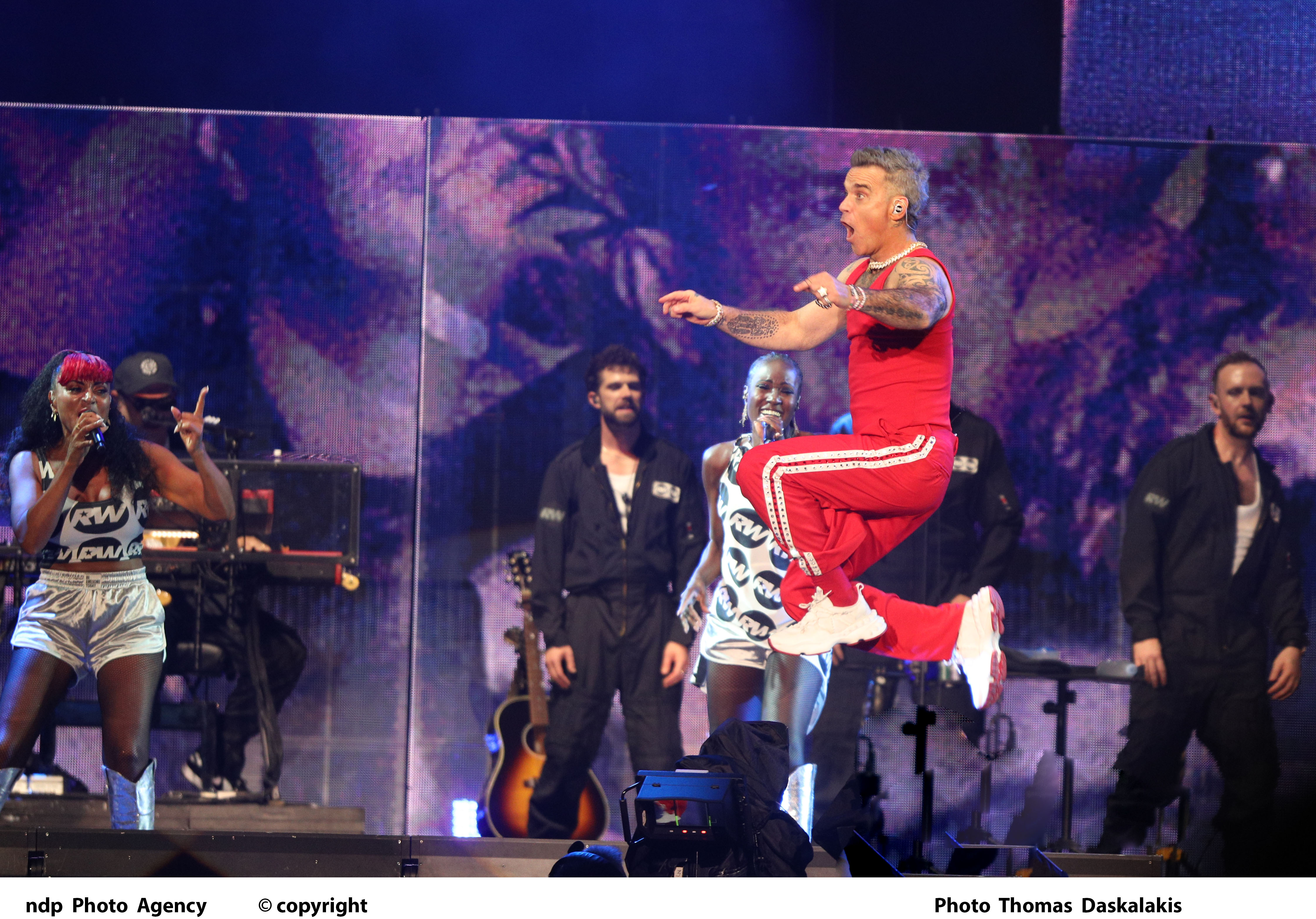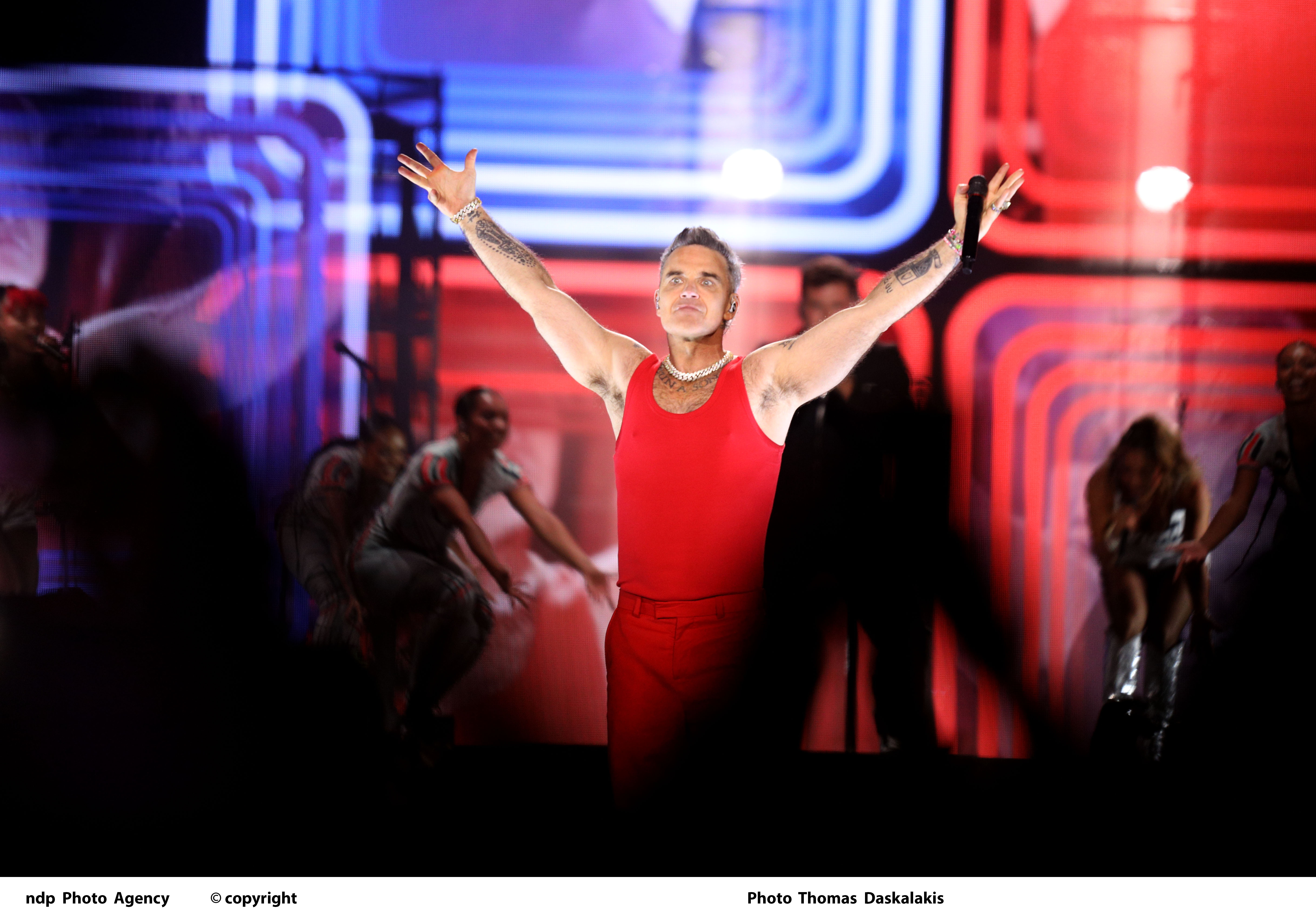 Όταν ο Robbie Williams έκανε την είσοδό του φορώντας κόκκινο αμάνικο και παντελόνι στην ίδια απόχρωση, το κοινό ξέσπασε σε παρατεταμένο χειροκρότημα και ζητωκραυγές. Από τα πρώτα λεπτά της εμφάνισής του κατάφερε να ξεσηκώσει τον κόσμο, ερμηνεύοντας με πάθος μερικές από τις μεγαλύτερες και πιο αγαπημένες του επιτυχίες, σε μια βραδιά που ένωσε χιλιάδες φωνές κάτω από τον αττικό ουρανό.