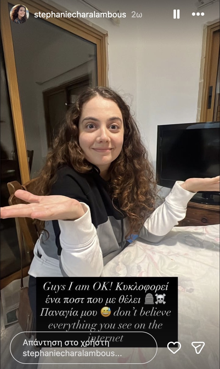 Η ίδια πανικοβλημένη από τα τηλεφωνήματα που έλαβε από αγαπημένα της πρόσωπα θέλησε να ξεκαθαρίσει πως είναι ζωντανή και έκανε ανάρτηση γράφοντας: «Παιδιά είμαι καλά. Κυκλοφορεί ένα πόστ που με θέλει νεκρή. Παναγία μου. Μην πιστεύεις τίποτα από όσα βλέπεις στο internet». Δείτε πιο κάτω τις αναρτήσεις της: