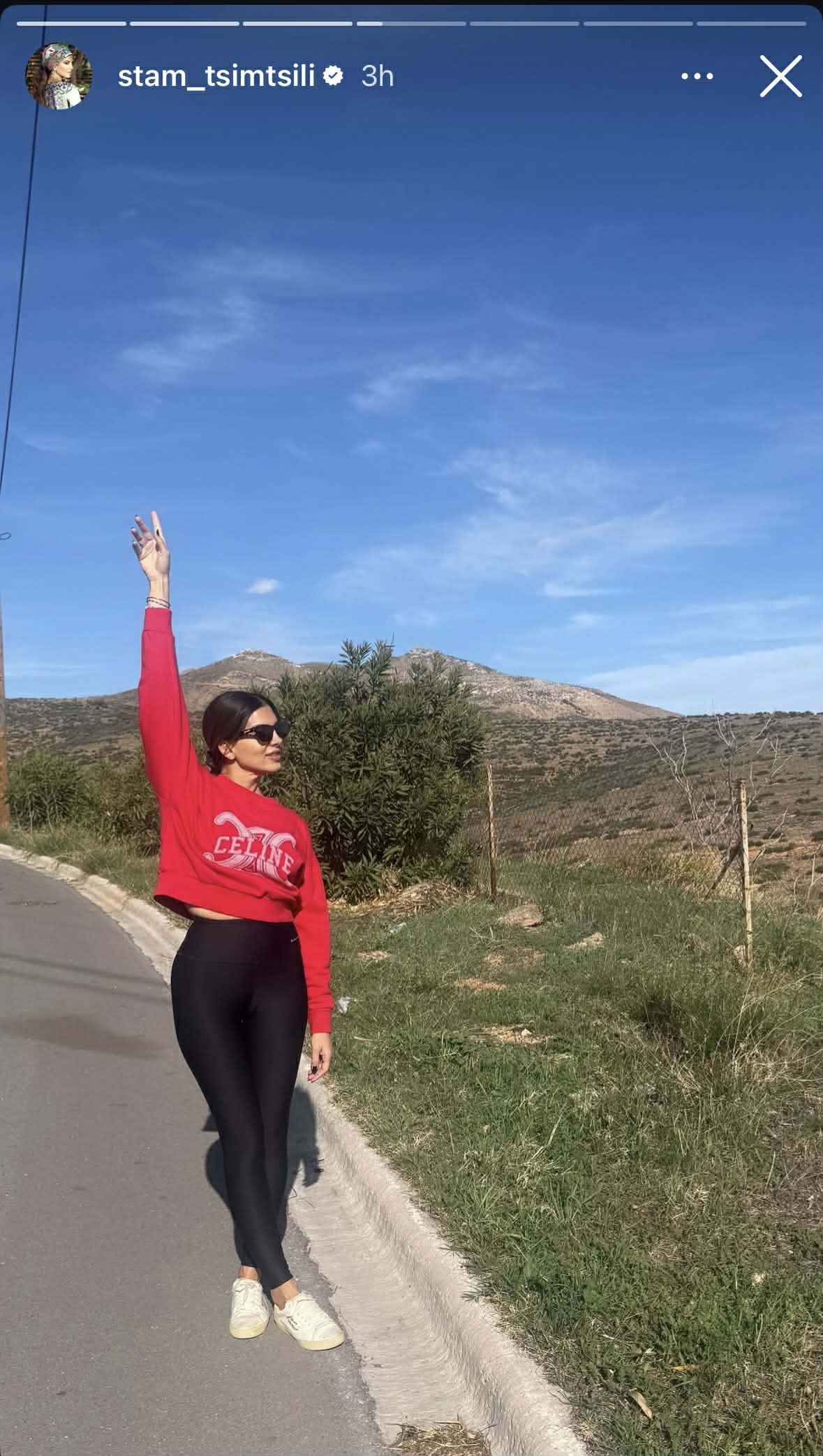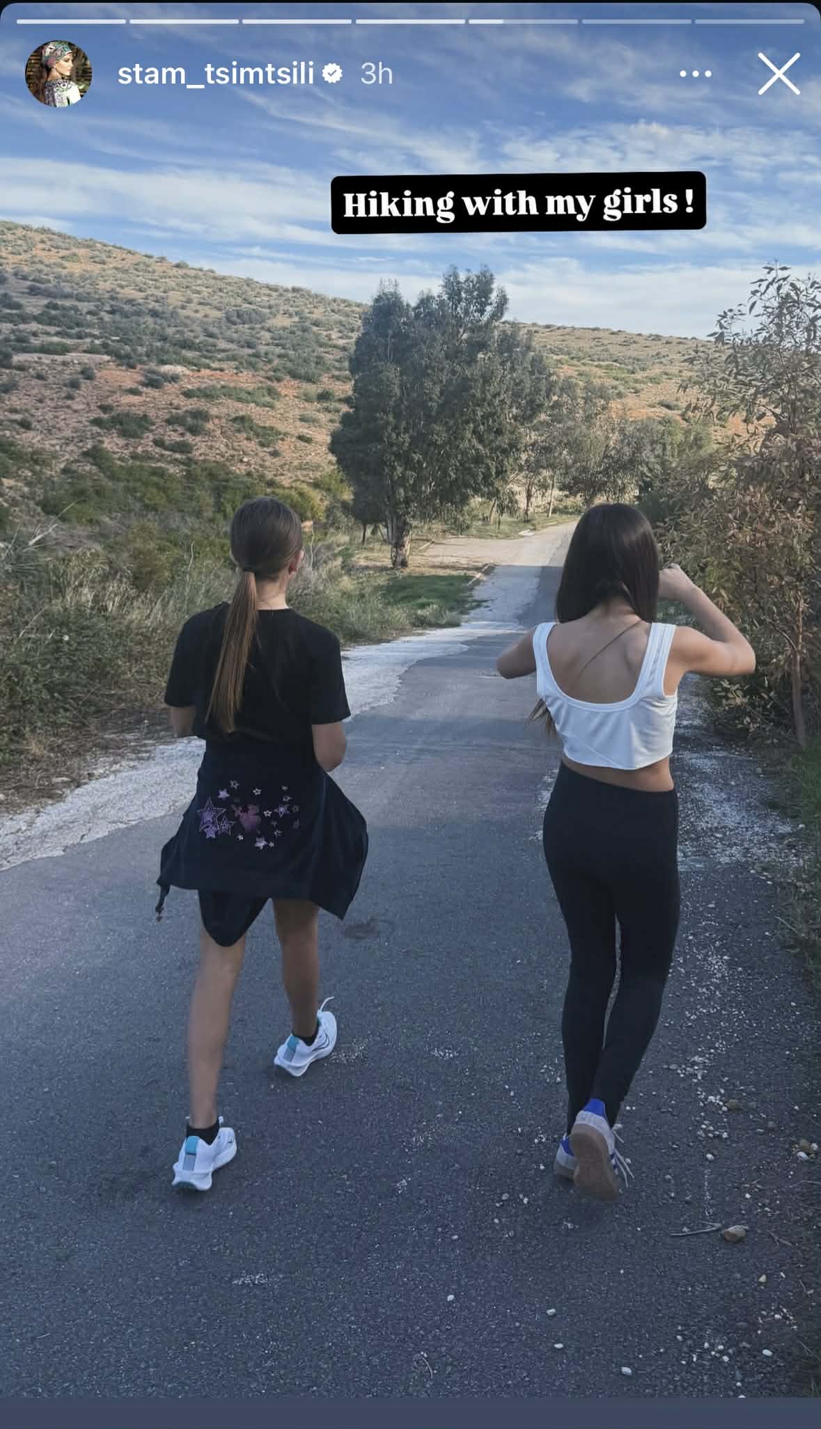 Η Ελληνίδα παρουσιάστρια, μοιράστηκε με τους διαδικτυακούς της φίλους στιγμιότυπα από το hiking και συγκεκριμένα στο πάνω μέρος του story έγραψε: «Hiking με τα κορίτσια μου».