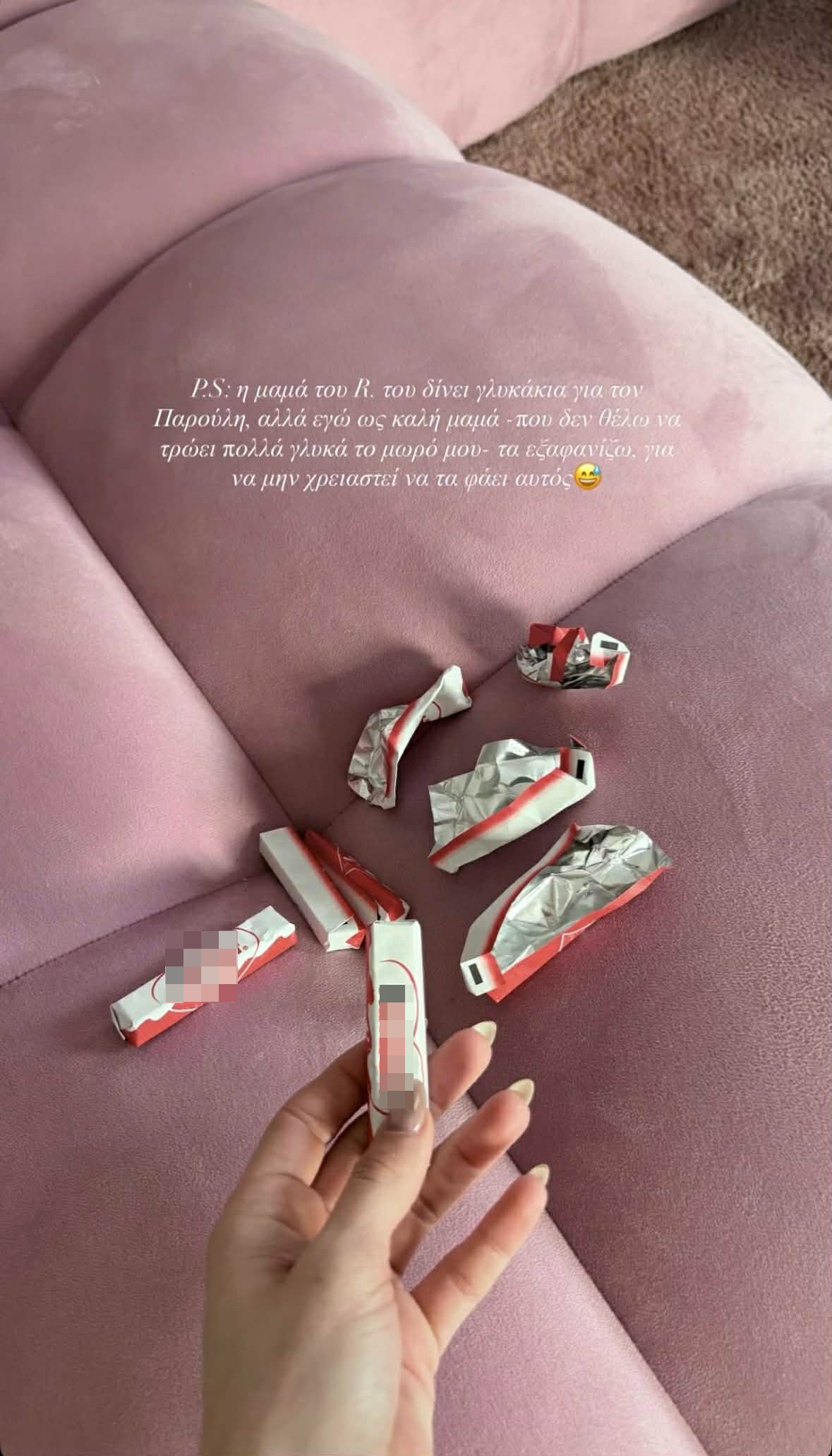 Πρόκειται για σοκολατάκια, τα οποία όπως χαριτολογώντας επεσήμανε η influencer τρώει εκείνη για να μην καταναλώνει ο γιος της μεγάλη ποσότητα ζάχαρης.