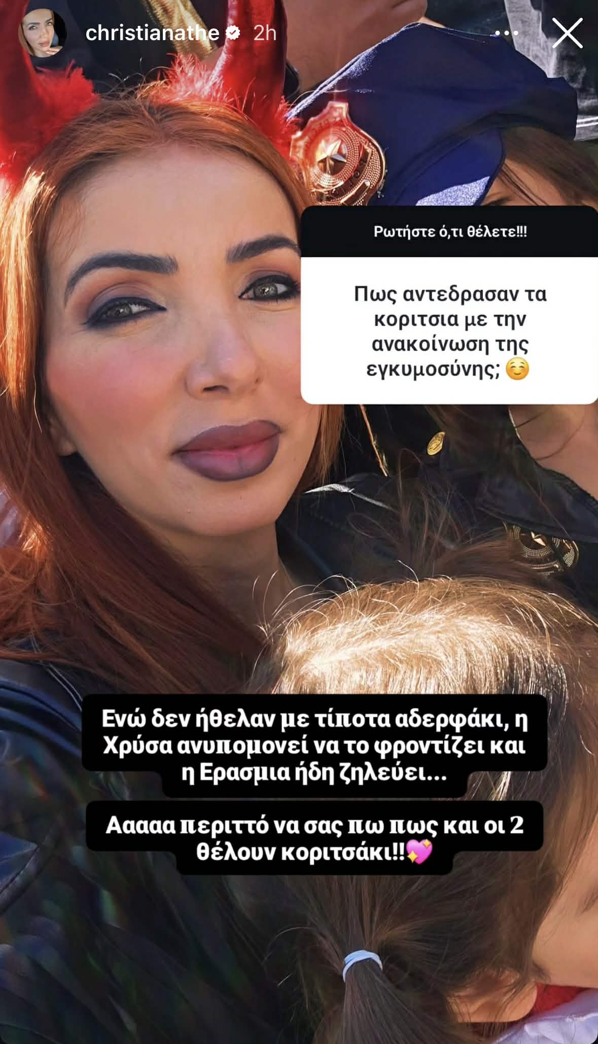 «Ενώ δεν ήθελαν με τίποτα αδερφάκι, η Χρύσα ανυπομονεί να το φροντίζει και η Ερασμία ήδη ζηλεύει. Α, περιττό να σας πω πως και οι δύο θέλουν κοριτσάκι», έγραψε.